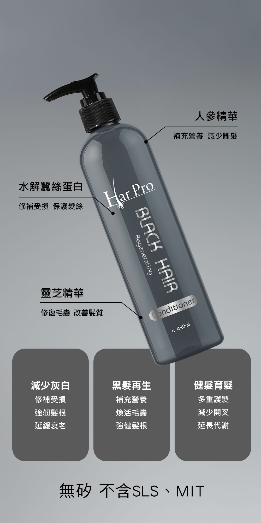 蘊含KerascalpTM 天然黑髮再生精華,能激活頭髮毛囊黑色素,讓黑髮從根源重生,回復原生髮色。無矽護髮配方,不含SLS、矽油、礦物油、MIT或MI,添加人參精華及水解蠶絲蛋白,能增加頭髮強韌度,令頭髮更有彈性,改善頭髮易斷及開叉問題,使頭髮不再打結,柔軟又亮澤。