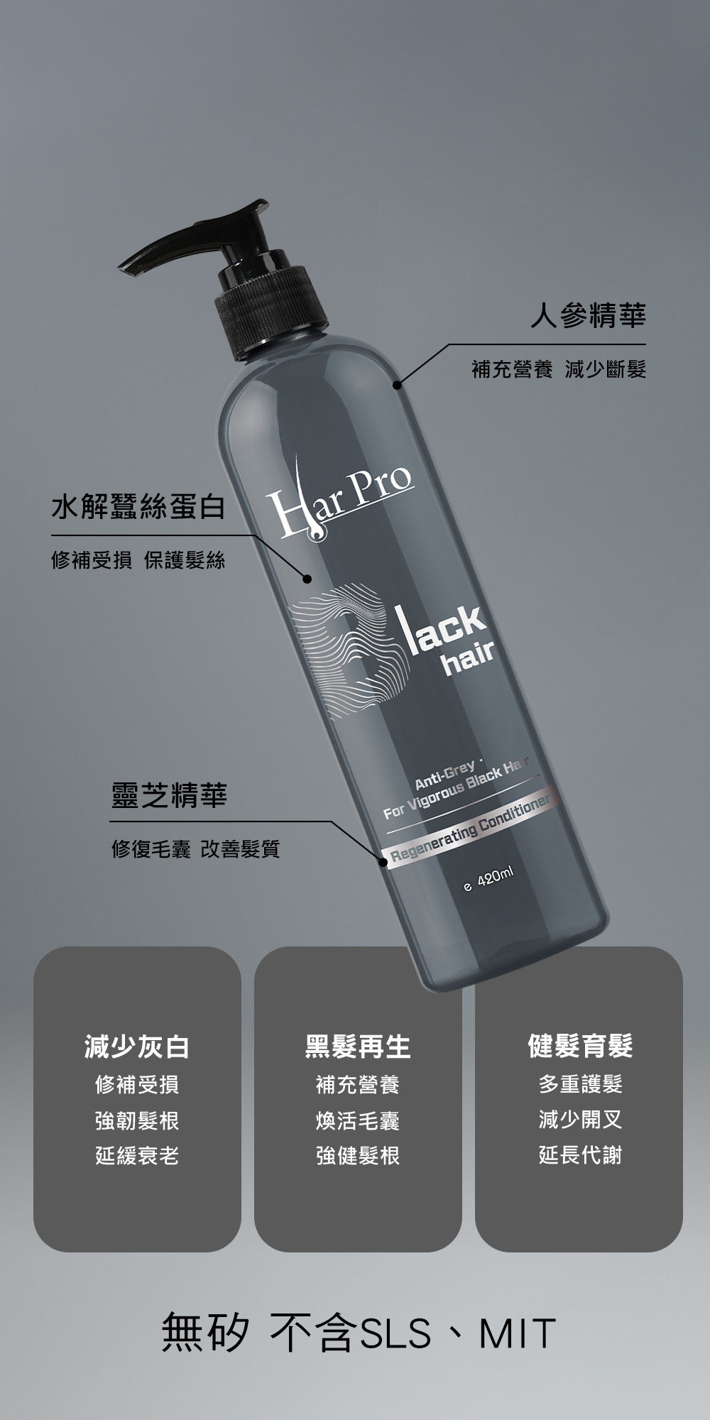 蘊含KerascalpTM 天然黑髮再生精華,能激活頭髮毛囊黑色素,讓黑髮從根源重生,回復原生髮色。無矽護髮配方,不含SLS、矽油、礦物油、MIT或MI,添加人參精華及水解蠶絲蛋白,能增加頭髮強韌度,令頭髮更有彈性,改善頭髮易斷及開叉問題,使頭髮不再打結,柔軟又亮澤。