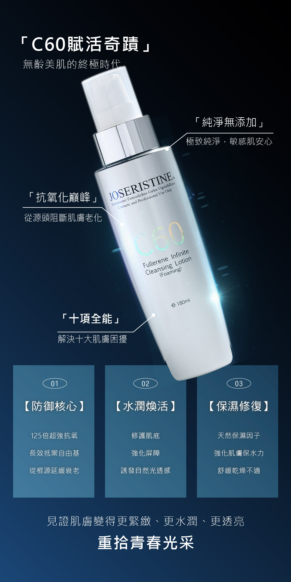 柔和泡沫配方,可潔淨面部多餘油脂及毛孔污垢。甄選卓越來自日本強效抗氧化成分C60富勒烯,能有效清除自由基,抗氧抗糖化雙重加持,可延緩肌膚老化。特別添加4D 透明質酸及多重天然植物抗敏精華,清潔同時將肌膚水分鎖住,賦予肌膚水潤光澤,清爽不繃緊。