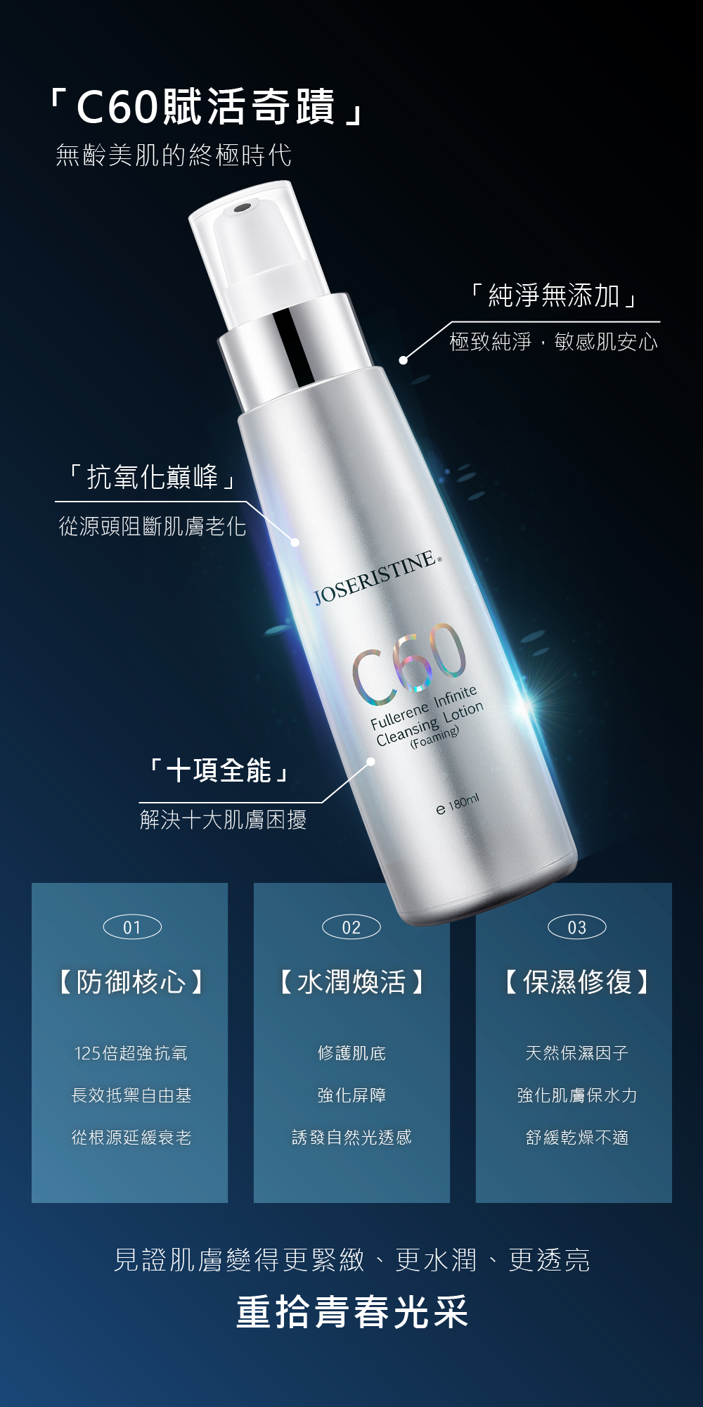 柔和泡沫配方,可潔淨面部多餘油脂及毛孔污垢。甄選卓越來自日本強效抗氧化成分C60富勒烯,能有效清除自由基,抗氧抗糖化雙重加持,可延緩肌膚老化。特別添加4D 透明質酸及多重天然植物抗敏精華,清潔同時將肌膚水分鎖住,賦予肌膚水潤光澤,清爽不繃緊。