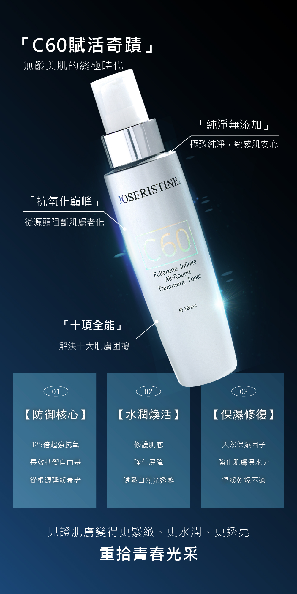 特別添加珍稀成分C60富勒烯,不添加防腐劑,其強大抗氧化力能有效清除自由基,促進肌膚新陳代謝,全效對抗肌膚老化,複配透明質酸等保濕因子,多重補水鎖水,同時幫助調理膚質,肌膚呈現水潤嫩滑,明亮細緻。