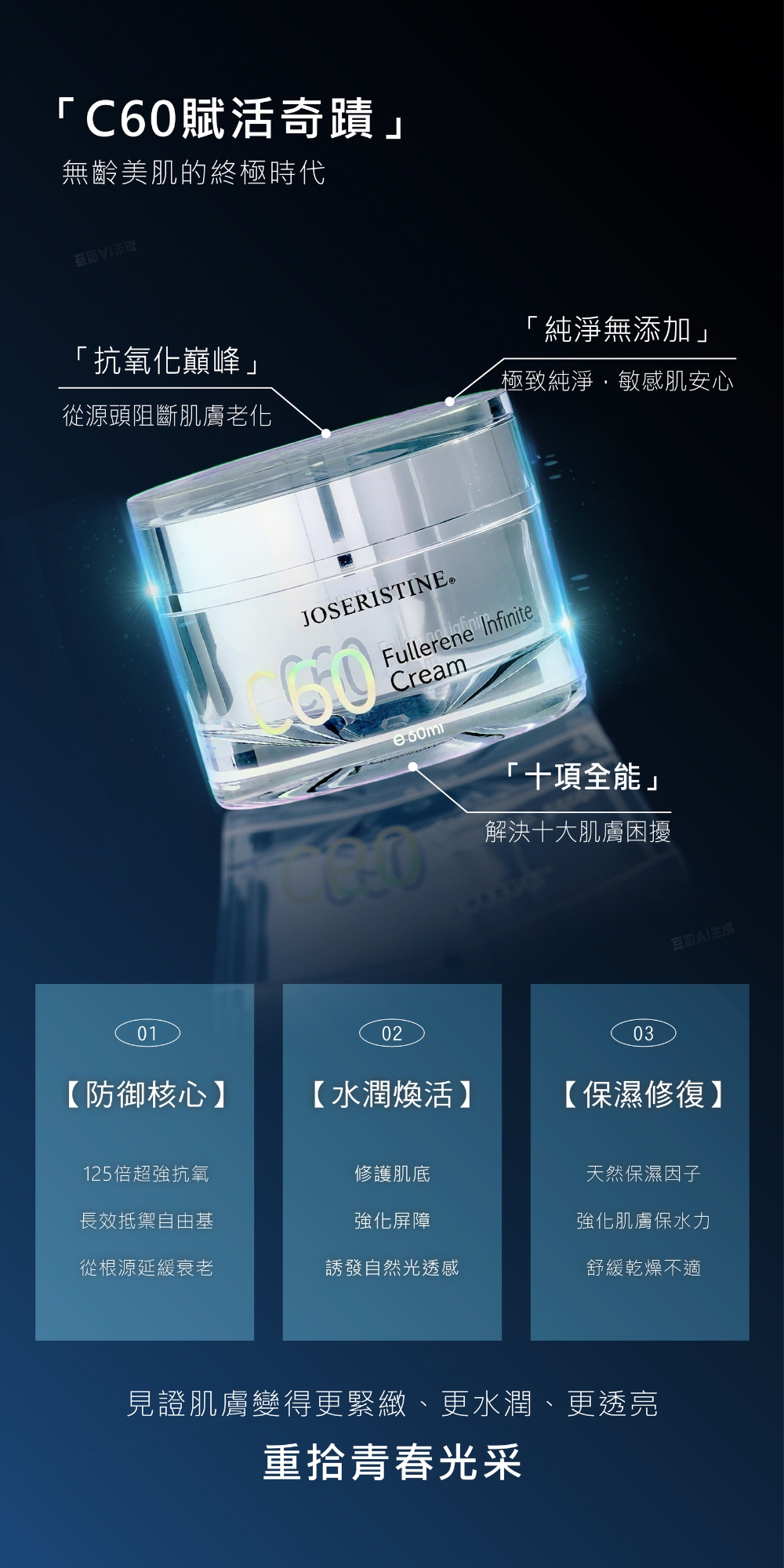 全新升級配方,不添加防腐劑;綿綿絲滑質感,甄選來自日本的雙重卓越強效抗氧化成分C60富勒烯,其高效抗氧力可有效清除自由基,於肌底啟動沉睡的肌膚細胞,促進肌膚新陳代謝,抗擊鬆弛、乾燥、色斑、暗沉、皺紋等肌膚問題,由內而外提升肌膚彈性,全面修護肌膚;神經醯胺3和4重透明質酸長效保濕因子,給乾渴肌膚完美滋潤,綻放晶瑩亮采。