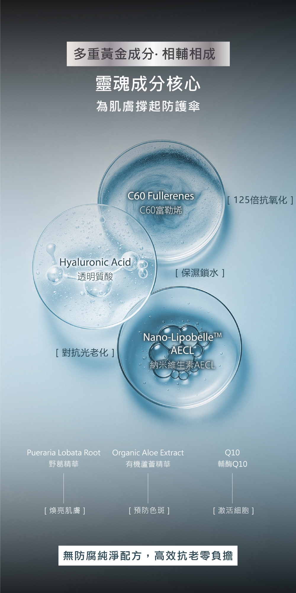 C60富勒烯、透明質酸、Nano-Lipobelle H-AECL(維他命E、玻璃苣籽油、卵磷脂、維他命A、維他命C)、野葛精華、有機蘆薈精華、輔酶Q10