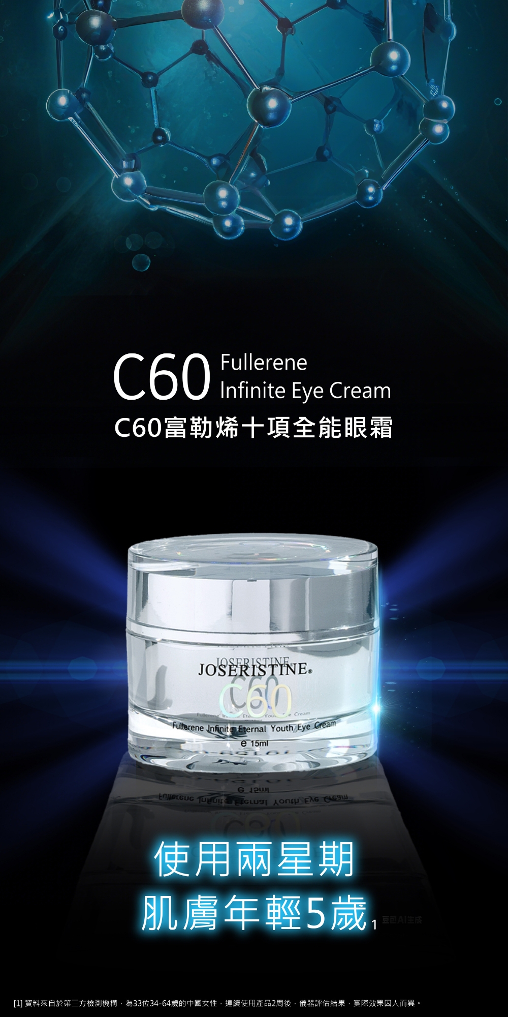 甄選來自日本的卓越強效抗氧抗糖化雙重成分C60富勒烯及多重修復精華,釋放奢華禦齡能量,於眼周肌底啟動沉睡的肌膚細胞,全效修復眼部肌膚問題,滋養、提升,減少糖化,令雙眸煥發年輕透亮神采,重回巔峰生機。