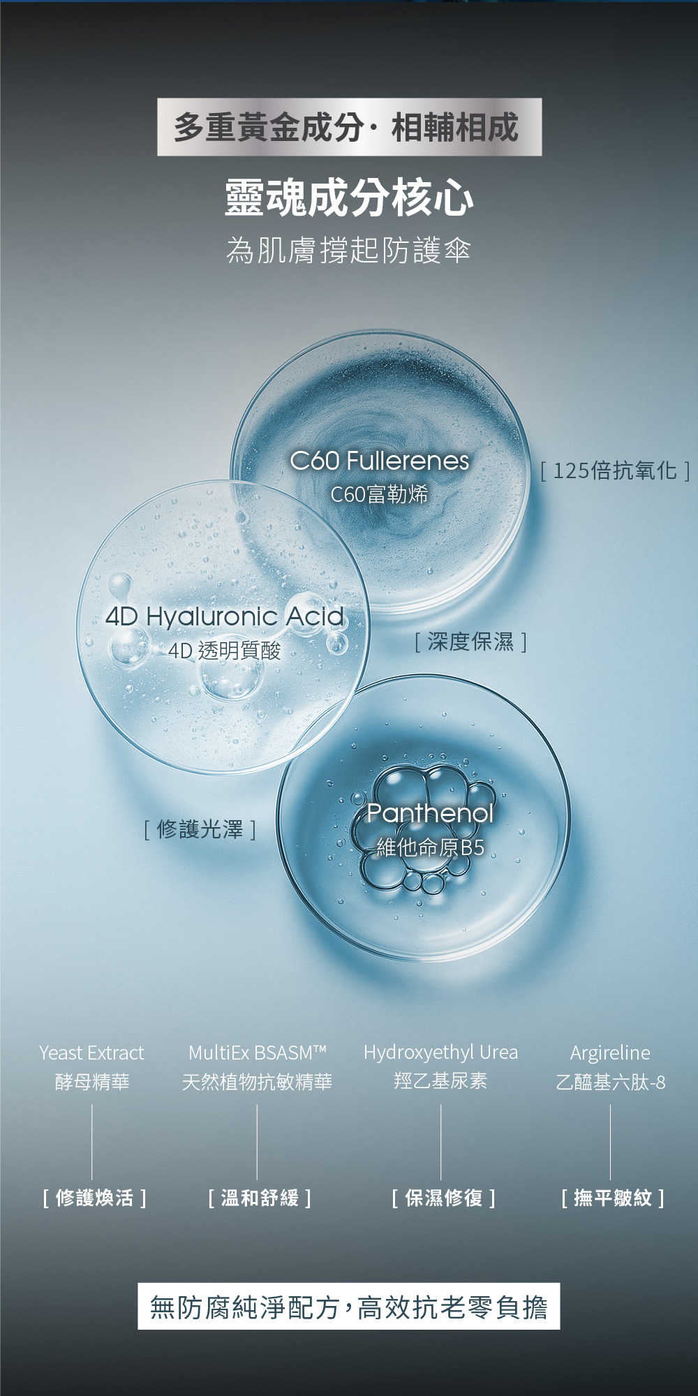 C60富勒烯、乙醯基六肽-8、4D 透明質酸、酵母精華、天然植物抗敏精華、羥乙基尿素、維他命原B5