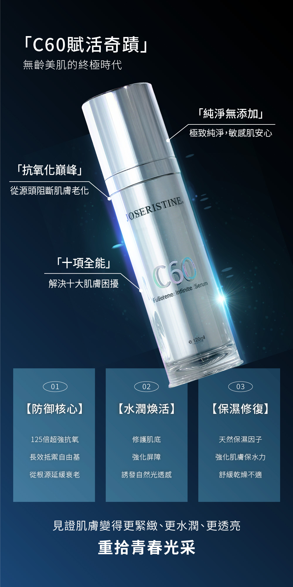 全新升級配方,不添加防腐劑;綿綿絲滑質感,甄選來自日本的雙重卓越強效抗氧化成分C60富勒烯,其高效抗氧力可有效清除自由基,於肌底啟動沉睡的肌膚細胞,促進肌膚新陳代謝,抗擊鬆弛、乾燥、色斑、暗沉、皺紋等肌膚問題,由內而外提升肌膚彈性,全面修護肌膚;神經醯胺3和透明質酸長效保濕因子,給乾渴肌膚完美滋潤,綻放晶瑩亮采。
