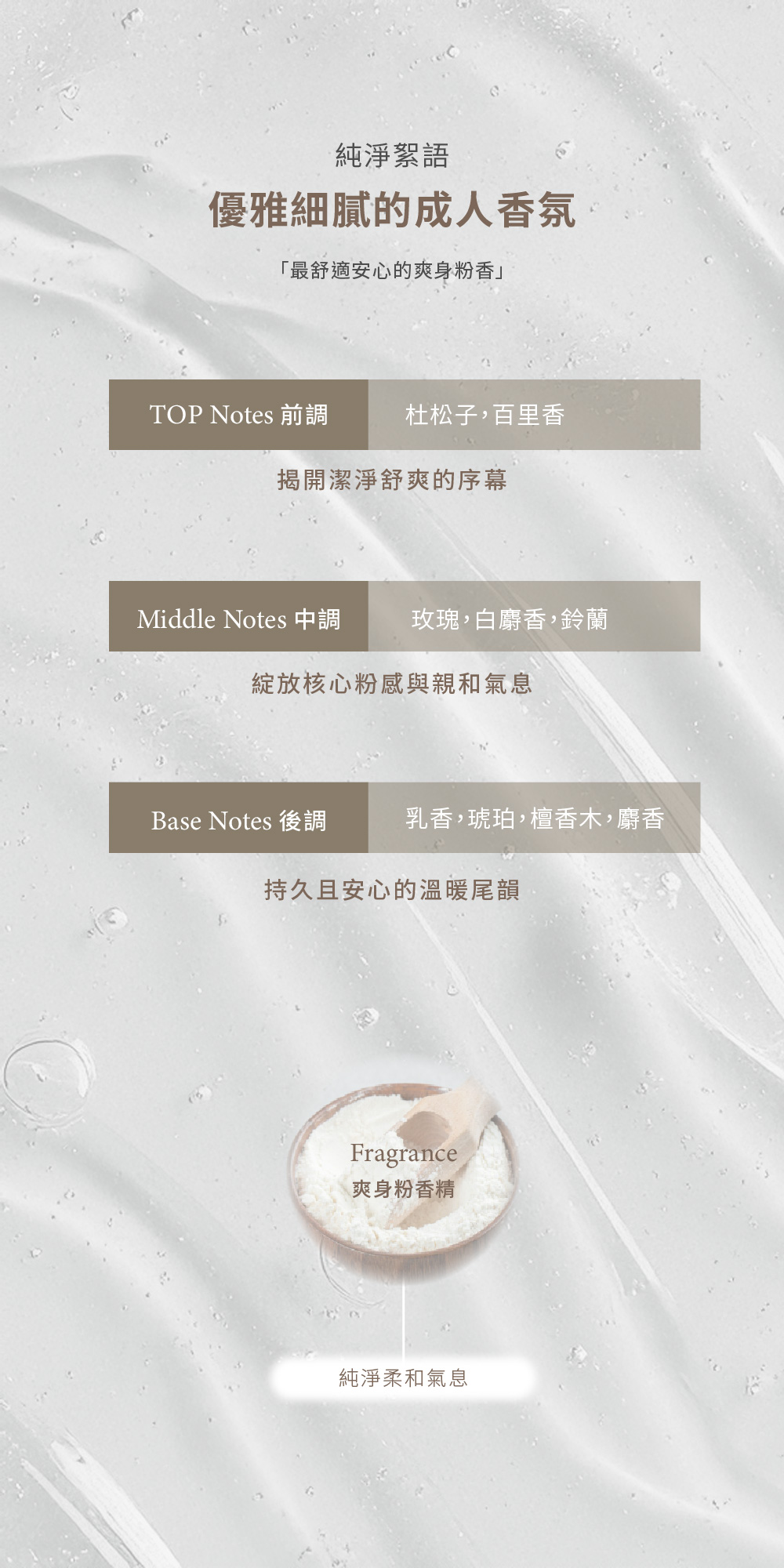 爽身粉香味給人一種舒服親切的感覺,牽引起無憂無慮的童年回憶,香味清新細膩。輕輕噴灑可以提升個人優雅魅力,更添自信風采。淡淡香氣撲鼻,散發純淨柔和的氣息,香味持久細膩