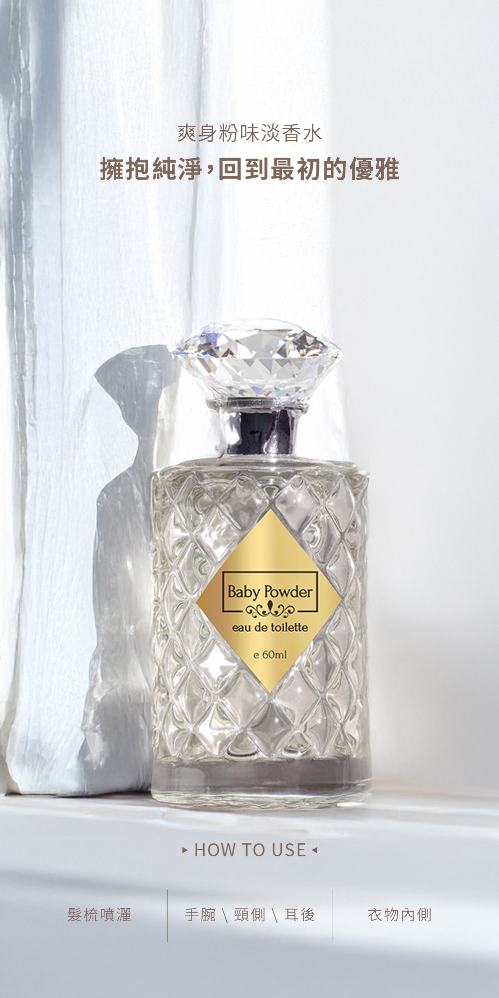 將爽身粉味淡香水輕輕噴於手腕、頸部、耳背或於梳頭前噴灑於梳子上,讓香味時刻縈繞身邊