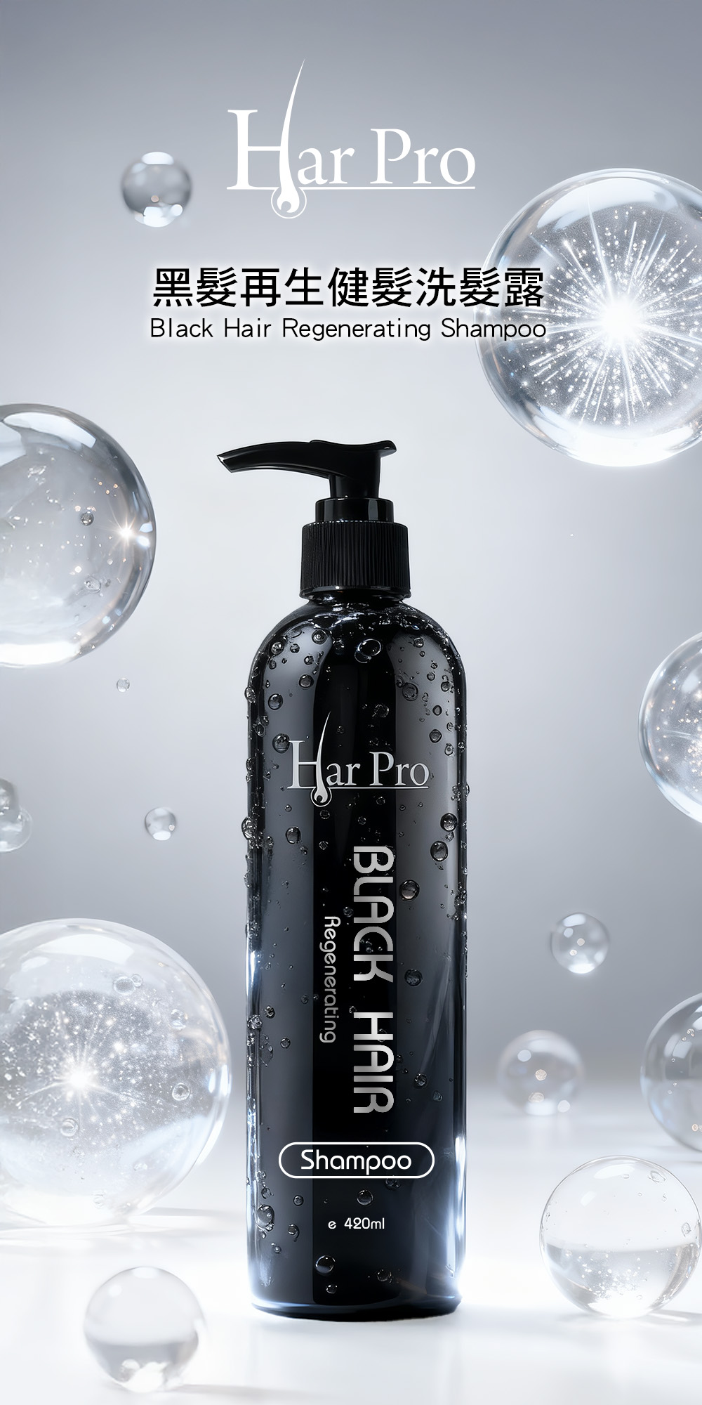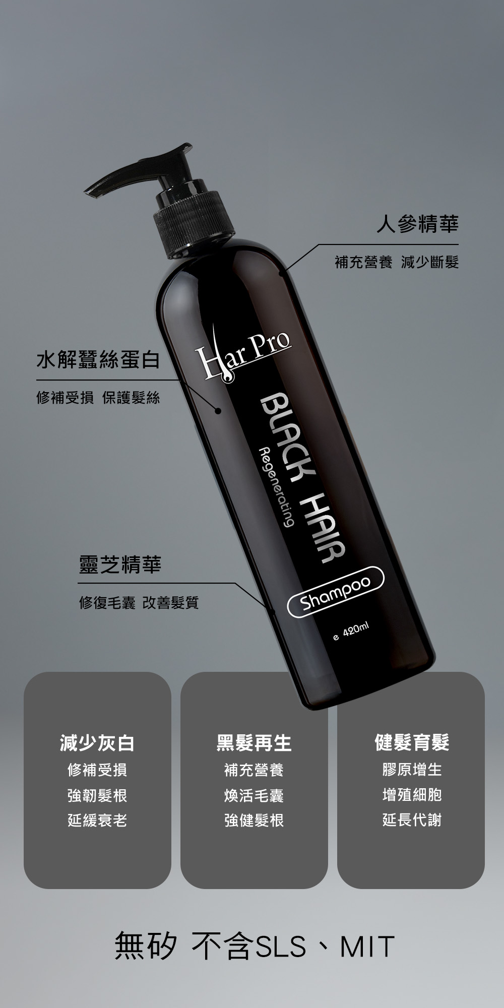 無硫酸鹽、無矽油成分,性質溫和,可洗淨頭髮污垢及化學殘漬,激活頭髮毛囊黑色素,促進黑髮再生,預防及減少白髪;有助養護頭皮健康和活力,還原自然烏黑亮澤秀髮。