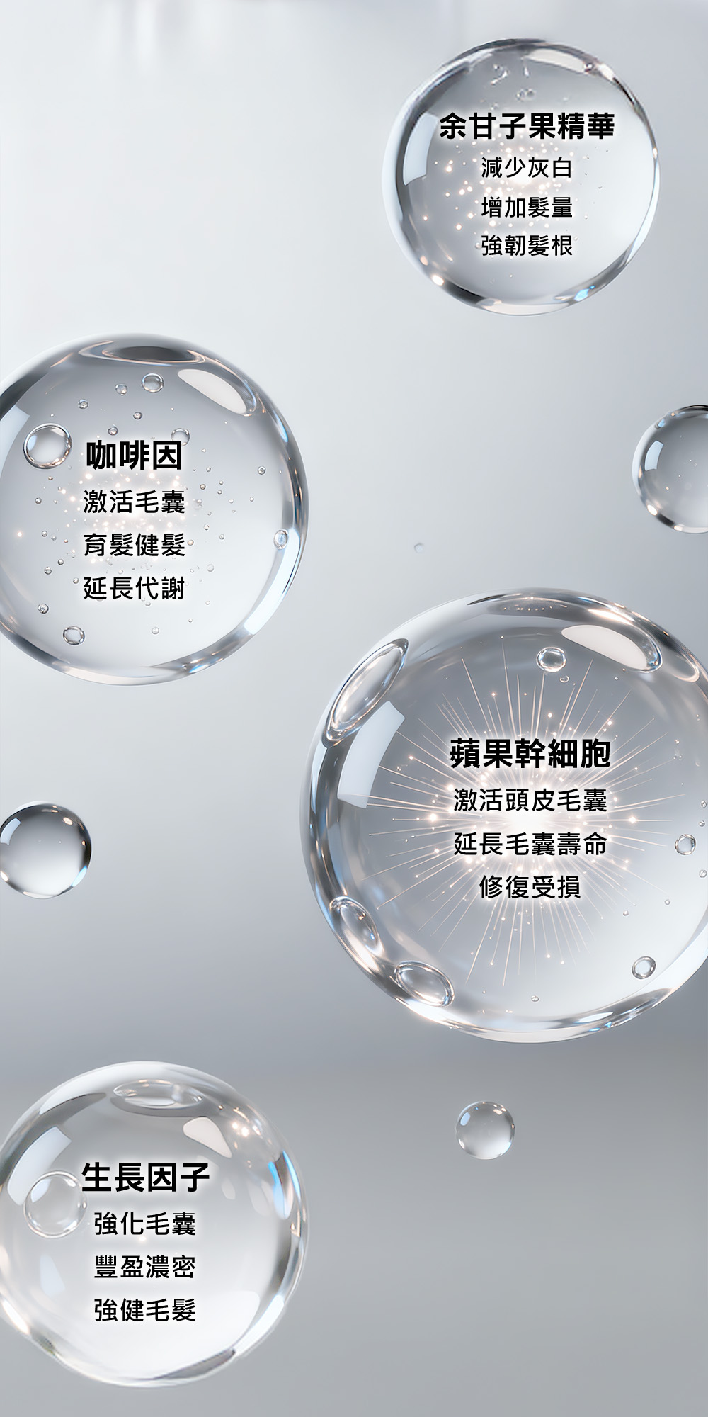 KerascalpTM、咖啡因、生長因子、蘋果幹細胞、靈芝精華、人參精華、水解蠶絲蛋白
